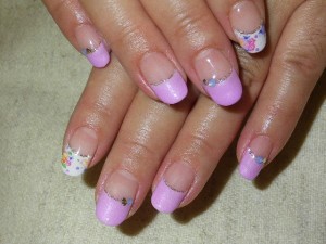 シャーベットカラーのパープルに合わせた小花柄です☆ 深めフレンチに合わせてストーンもポイントになってとってもかわいいです!