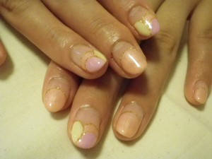最近人気のデザインです☆ 3色使って、変形フレンチ! まるーいかんじが女の子らしいですね!